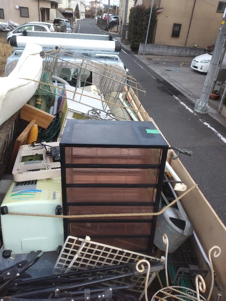 埼玉県川口市北原台 今日は女性からのご依頼で、一軒家の不用品ゴミの処分をさせて貰いました。2トントラック2台の予定でしたが、家具とかは解体して、2トラック1台と軽トラック1台で納めました!値段も安くすんだので、とても喜んで貰いました。不用品回収やゴミ屋敷、遺品整理、便利屋