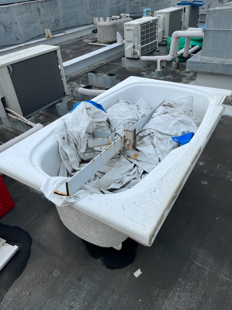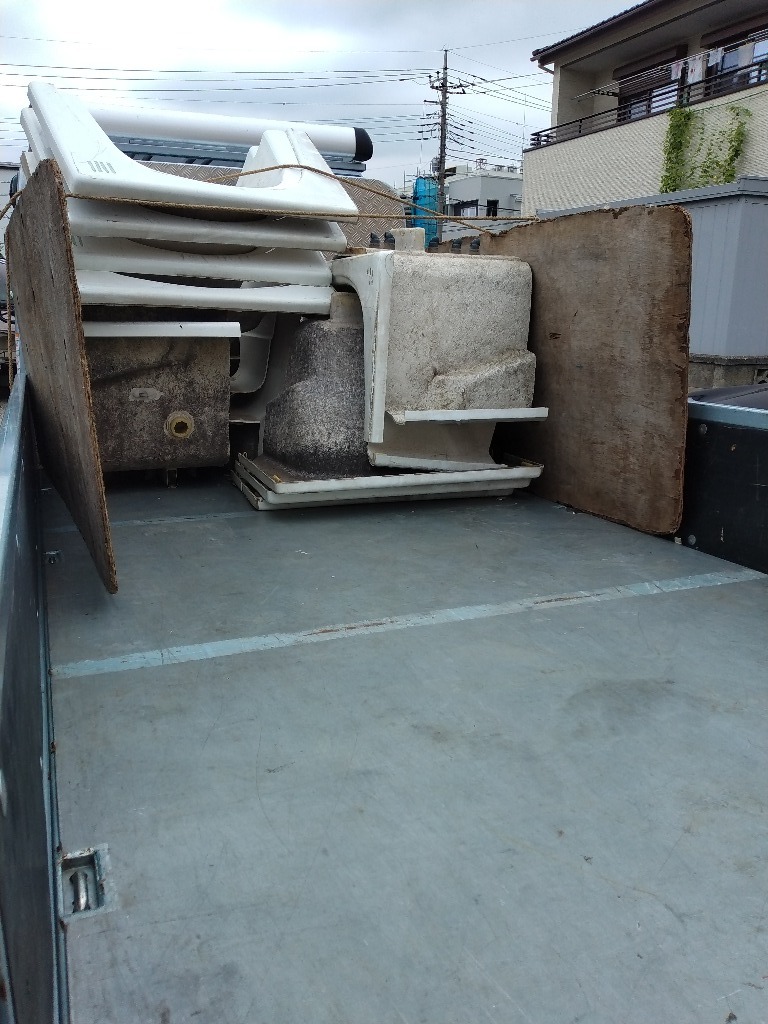 東京都町田市 今日はラブホテルのオーナーさんからのご依頼をいただきました。屋上に置いてあるお風呂の浴槽を裏返し、エレベーターで搬入できるサイズまで解体してから、処分をさせて貰いました。不用品回収、遺品整理、ゴミ屋敷、便利屋